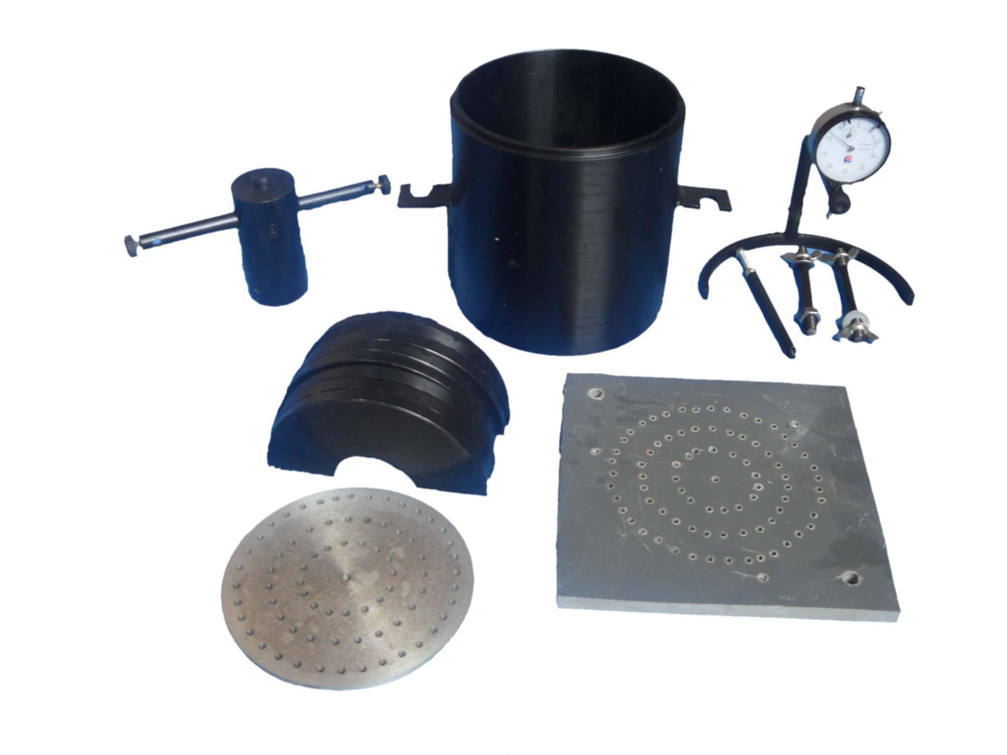 试验附件包含:多孔板(铝)9个、多孔板底座(塑料)9个、试筒(钢)9个、0-10百分表9块、表架9个、荷载板72个、压头(贯入杆)1个、重型击实仪一套(选配)